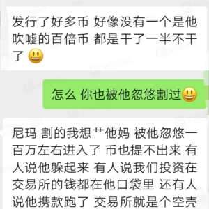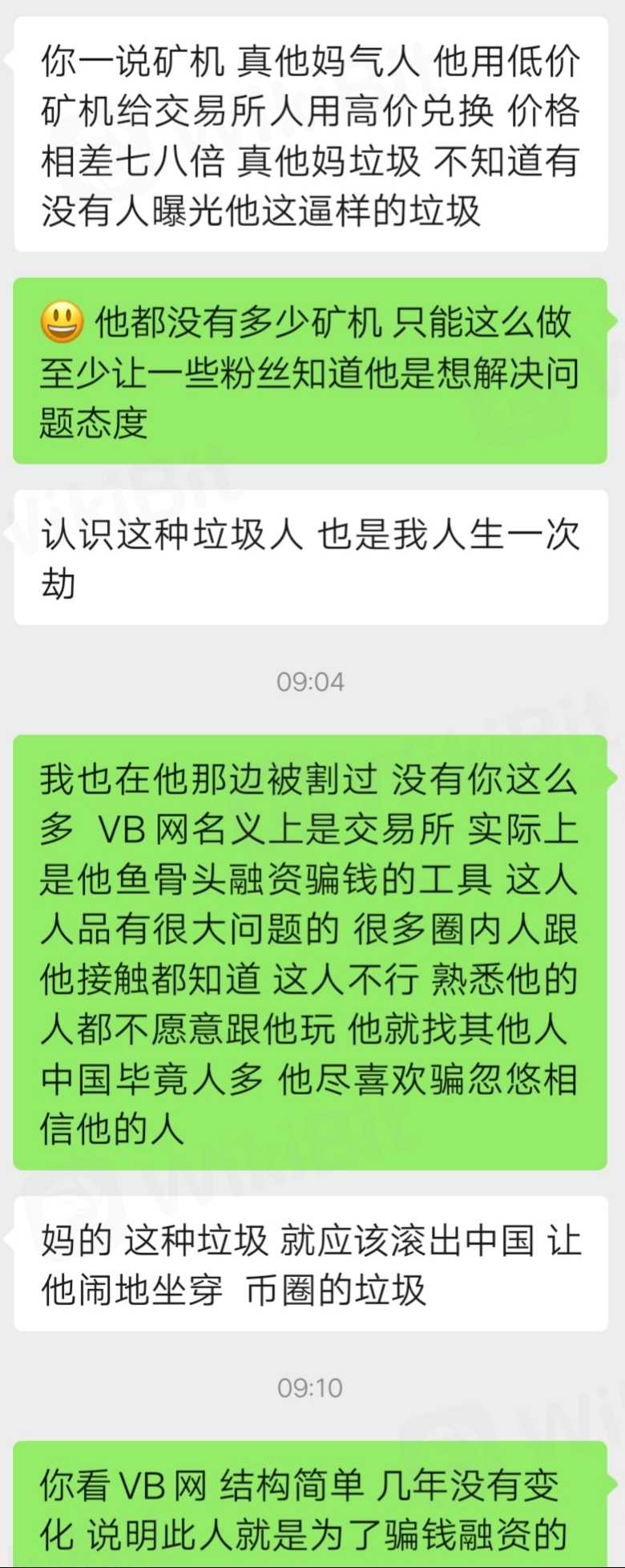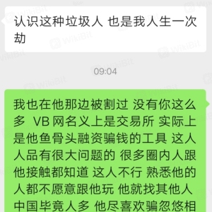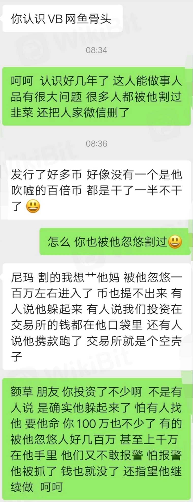 VB网创始人鱼骨头通过VB网大量骗取忽悠投资者投资上百万上千万资金,VB网里面资金被他掏空做合约等玩完现在很多人长达一年以上提不出币出来 几百万上千万资金在交易所就是个数字无法兑现 ,有粉丝已经有暴力倾向性质。