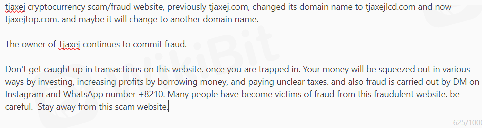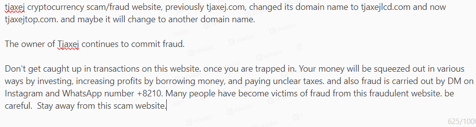 tjaxej cryptocurrency scam/fraud website, previously tjaxej.com, changed its domain name to tjaxejlcd.com and now tjaxejtop.com. and maybe it will change to another domain name.The owner of Tjaxej continues to commit fraud. Don't get caught up in transactions on this website. once you are trapped in. Your money will be squeezed out in various ways by investing, increasing profits by borrowing money, and paying unclear taxes. and also fraud is carried out by DM on Instagram and WhatsApp number +8210. Many people have become victims of fraud from this fraudulent website. be careful. Stay away from this scam website.