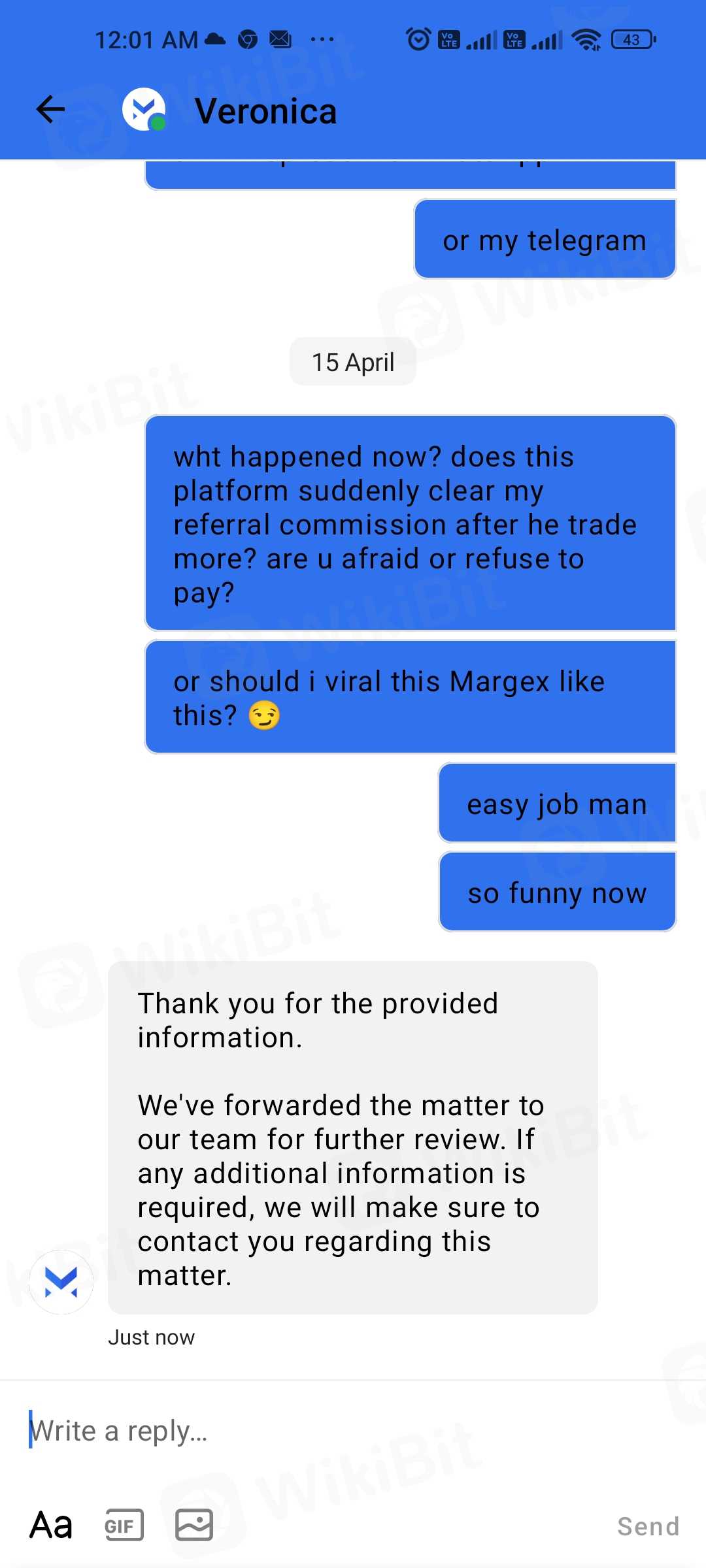 這個 MARGEX 完全是騙局!!我的佣金 USD165(來自推薦交易)被刪除了,沒有任何解釋!!然而,當我詢問客戶服務時,沒有回覆,也沒有解釋為什麼我的佣金消失了。他們提供 40% 的交易佣金,但他們不會支付!!關於這個 MARGEX 的另一個有趣的事情是,當你從這個 MARGEX 提取加密貨幣到其他加密錢包時,需要 24-48 小時才能收到,而如果你使用 Bitget 或 Bybit,通常在 1-5 分鐘內就能收到加密貨幣。請避免使用這些應用程式!!下面是我附上的證據