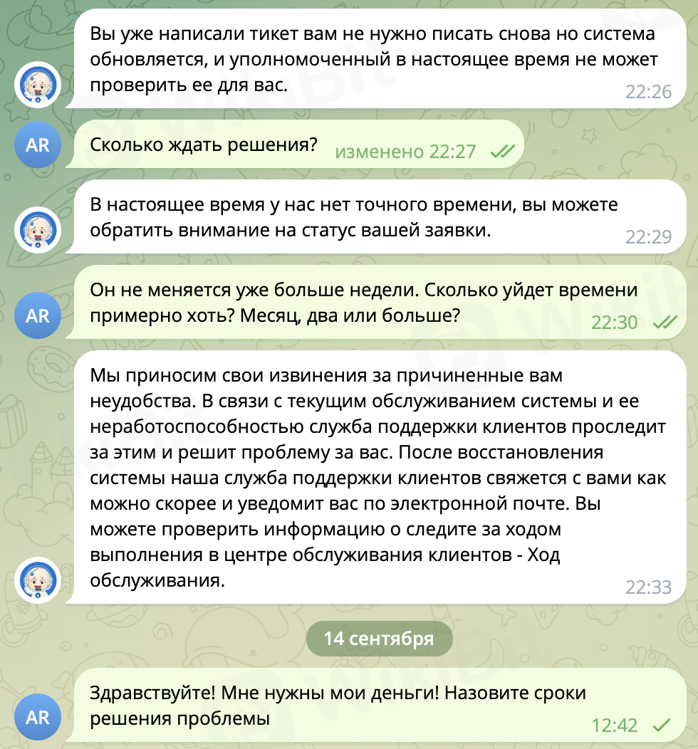 我已經等待了2個星期,希望存款能夠入賬。2個星期前已經發送了貨幣。管理層稱這是技術問題,並且沒有給出任何解決方案的截止日期。他們只是說等待,就這樣。儘管資金補充以正常模式運作。
