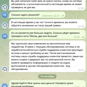 Я уже 2 недели жду зачисления средств на депозит. Отправил монеты 2 недели назад. Администрация ссылается на технические проблемы и не называет никаких сроков решения. Просто говорят ждите и все. Хотя пополнение баланса работает в штатном режиме----------I've been waiting 2 weeks for the deposit to be credited. Sent the coins 2 weeks ago. The administration refers to technical problems and does not give any deadlines for a solution. They just say wait and that's it. Although the replenishment of the balance works in normal mode
